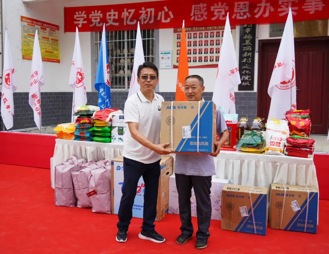 (乐山市保险行业协会秘书长税俊代表乐山市保险业向碑坪村党员代表捐赠慰问物资)